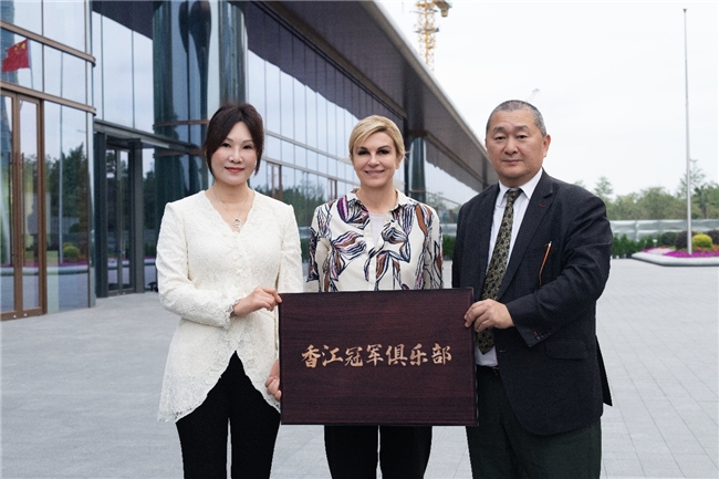随后,科琳达与香江集团主席刘志强、董事长翟美卿,共同为香江1号“冠军之家”揭牌。在仪式上,科琳达发表讲话,将体育领域的冠军精神升华至关乎人类文明与未来生活的全新“奥林匹克”赛场。她指出,香江1号凭借三大显著优势引领这场全球竞争:智能科技赋能,解放人类时间与思想;生态健康护航,守护地球家园与身心健康;文体艺术浸润,滋养社区精神与文化活力。作为科技、人文与自然深度融合的典范,香江1号为人类文明新赛事提供了“战略型冠军”的中国范本。